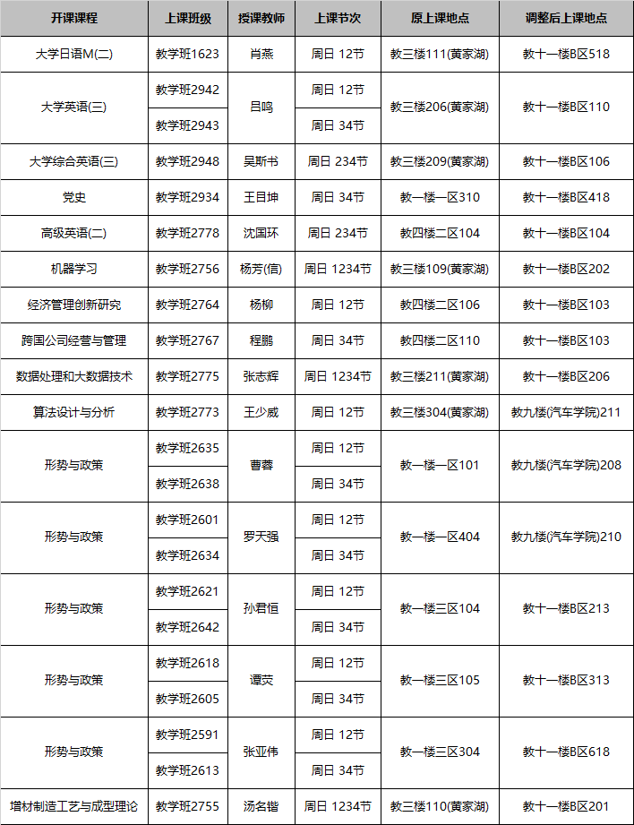 黄家湖校区教一楼(一区、二区、三区)、教二楼、教三楼、教四楼二区,4月13日7:00 - 12:00封楼。受到影响的课堂调整见下表:
