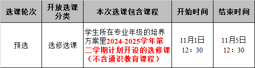 根据本科教学工作安排,现组织各年级本科生进行2024-2025学年第二学期选修课(不含通识教育课程)的预选,内容如下:
