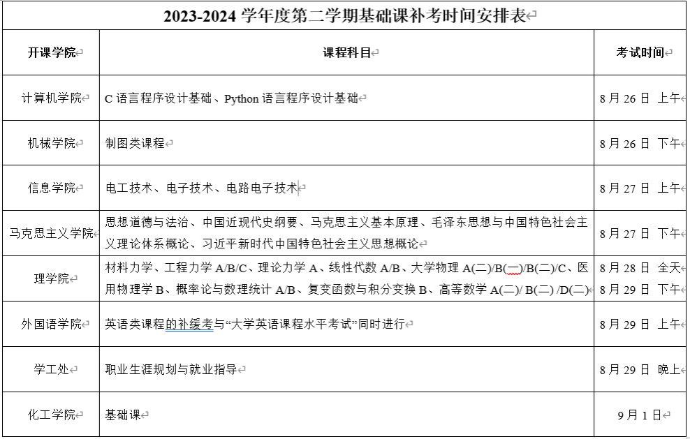 2023-2024学年第二学期课程补(缓)考定于2024年8月26日至9月1日进行,为顺利完成补考工作,现将有关事项通知如下: