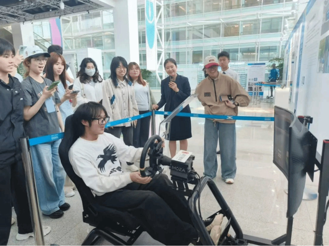 同学们通过各种互动体验,感受深圳固德智能科技有限公司的MOZA RACING高端专业赛场模拟器的带来的强劲反馈力,让人仿佛置身真实赛道;深圳冠旭电子股份有限公司的Cleer ARC 3音弧开放式AI耳机的气传导技术,带来纯粹音质的同时还有“意外”舒适的优质体验。