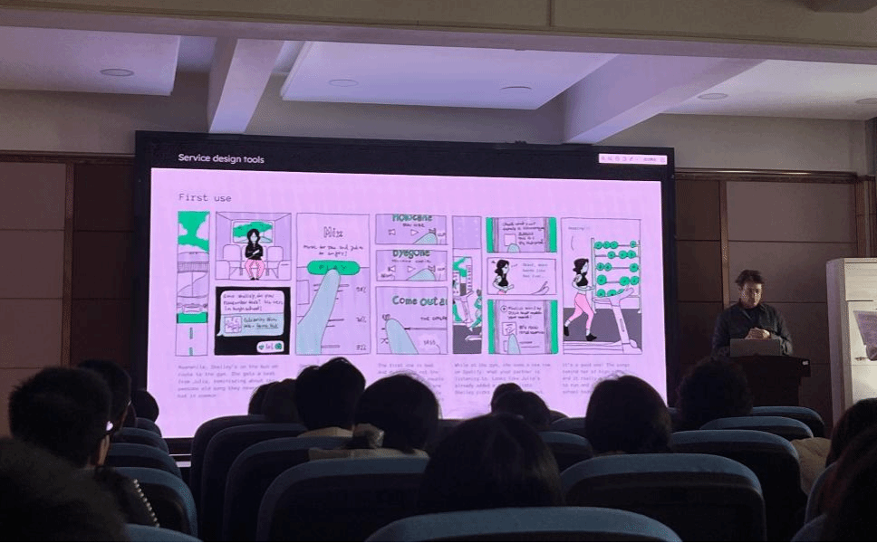 乔昂围绕“什么是服务设计”、“什么是AI”、“如何利用AI将想法变为现实”三个问题阐述了服务设计和人工智能在设计领域的应用前景与独特优势。他结合曾在安永会计师事务所、Barclays银行等负责产品服务的自身经历,介绍了业务、技术、设计等多部门团队及其主攻板块。“艺术设计已进入服务业时代,关注用户体验、传递重要性是核心。”乔昂强调,并鼓励员工们积极运用服务蓝图、故事板等工具,将“以人为本”的理念贯穿始终。