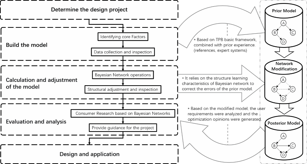 如下图所示,研究方法的内容包括从构建项目到构建具体的分析模型,再到分析评估,最后完成设计应用的主要内容。其中,贝叶斯网络需要识别节点因素,并根据这些内容完成调查和数据收集。导入数据后,通过贝叶斯网络的结构学习,形成合适的贝叶斯网络结构。通过这些充分的信息,可以发现隐藏的用户需求信息,最终帮助完成设计工作。