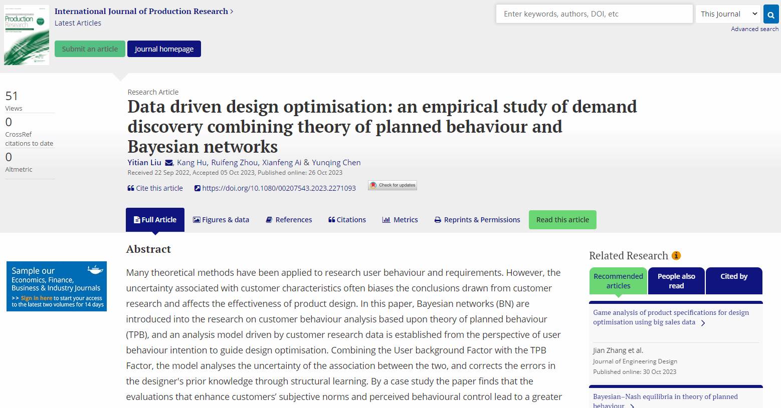 近日,英国Taylor & Francis公司旗下著名期刊《International Journal of Production Research》在线发表了公司博士生刘伊天、胡康副教授、艾险峰副教授等学者合作的研究成果“Data driven design optimisation: an empirical study of demand discovery combining theory of planned behaviour and Bayesian networks”,该论文提出了一种消费者行为意愿的研究方法,可以用于产品设计开发阶段以及迭代优化阶段。