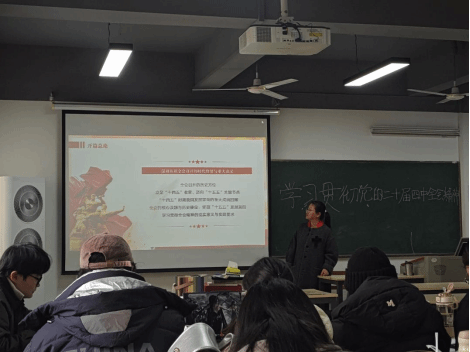 互动交流环节,2025 级设计学研究生韩舸分享感悟:“此次宣讲让我清晰把握了党的二十届四中全会精神的时代内涵与实践要求,翁雯霞老师对‘十五五’蓝图、红色基因传承与高质量发展的解读令我深受启发。作为设计学研究生,我将立足专业,以创新设计传递红色文化、回应时代需求,助力高质量发展,争做有担当的新时代青年研究者。”