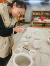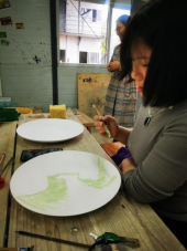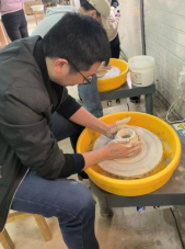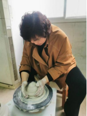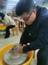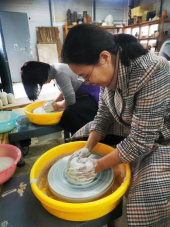陶艺制作活动现场,指导老师首先讲解、演示了传统拉坯的成型方式,接着对青花及釉下五彩的风格特点和绘制方法进行讲解,最后老师们亲身体验陶瓷制作的过程。