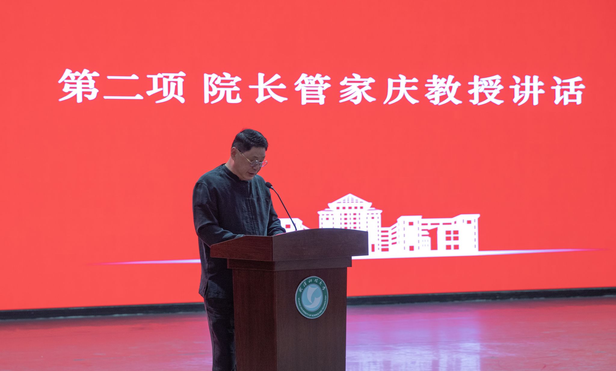 “起来不愿做奴隶的人们,把我们的血肉筑成我们新的长城……”典礼在众人合唱中华人民共和国国歌的歌声中拉开帷幕。大会第二项,公司经理管家庆上台致辞。他优先肯定了2023级新生的过往努力及军训成果,并祝贺他们成为公司及公司的一员,同时他还特别介绍了公司近年来取得的优异成绩,此外,他还向新生们提出了殷切期望,他说道:“希望大家都能够做到崇德尚艺、敢于争先;明确目标、勇于担当;自觉行动、知行合一,再进而成长为有能力、有担当、有理想的青年设计人才。”他还强调崇德是根基,尚艺是花叶,崇德尚艺是值得修习一生的功课。