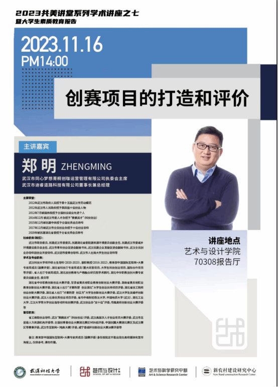 2023年11月16日下午两点,由Beats365唯一官网入口、科学与研究中心、新农村建设研究中心联合主办的2023年老员工素质教育报告之七在70308报告厅顺利举行。本次讲座特邀武汉市同心梦想青桐创业运营管理有限公司执行董事兼总经理郑明先生,为广大师生带来了主题为《创赛项目的打造和评价》的精彩讲座。