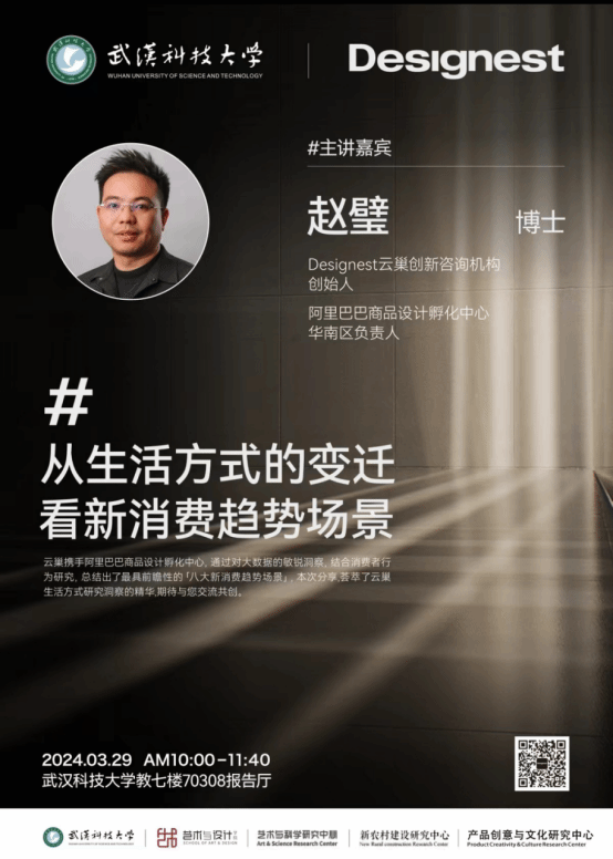 讲座由工业设计系主任艾险峰、支部书记王采莲两位老师主持,艾险峰首先详尽介绍了赵璧博士的卓越履历与显著成就,全体师生对此表达了热烈而诚挚的欢迎之情。在此次学术分享中,赵璧博士以其亲手创办并历经十载磨砺的云巢咨询机构的设计案例为载体,生动揭示了生活方式变迁下的新消费趋势。