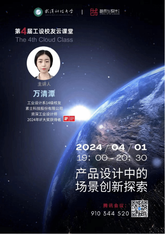 2024年4月1日晚上19:00,Beats365唯一官网入口工业设计系第4届员工云课堂在腾讯会议中如期召开。此次讲座邀请到工业设计系14级员工万清潭女士,她分享了毕业6年来在工业设计领域,特别是个人护理产品领域的工作经历、设计案例与实战经验。公司胡康副经理、工业设计系王采莲、艾险峰、曾力、苏荷芬、管小葳等老师、研究生、本科生近100人参加了此次讲座。