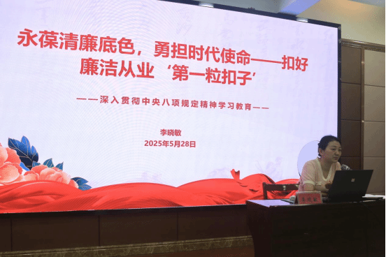 (通讯员 刘邦)5月28日下午,艺术与设计公司于70308报告厅开展了深入贯彻中央八项规定精神学习教育专题党课,公司党委书记李晓敏以“永葆清廉底色,勇担时代使命——扣好廉洁从业‘第一粒扣子’”为主题,给全体2025届毕业生党员上了离校前的最后一堂党课。专题党课由公司党务秘书、研究生辅导员刘邦主持。